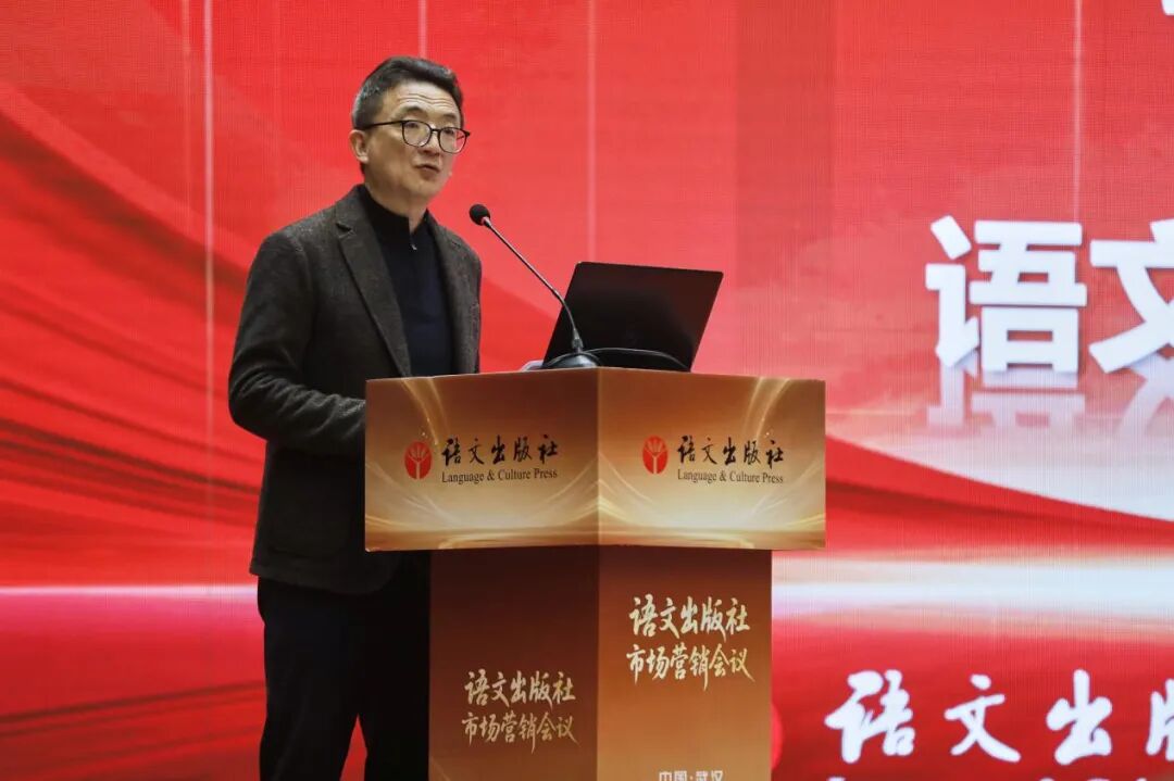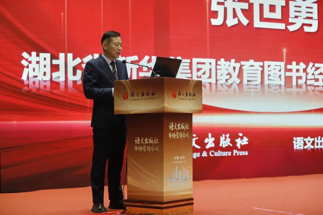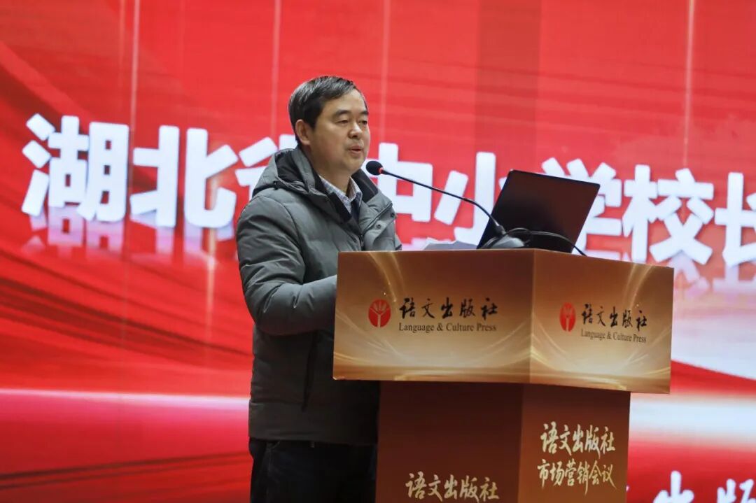 湖北省新华集团教育图书经销公司总经理张世勇代表发行渠道商致辞。他高度认可语文社在政策响应、内容品质等方面的突出优势,强调语文社产品因权威性强、适配性高,持续赢得师生与市场信赖。他提出,面对行业转型期政策趋严、需求分层的新形势,发行渠道不再是单纯的流通环节,更应成为教育服务的延伸与价值传递的纽带。他表示,湖北省新华集团将充分发挥网络覆盖广、本地化服务等优势,深化与语文社理念对齐、资源协同,共同构建顺畅高效的产供销生态,以出版与发行的深度协同,服务教育高质量发展大局。