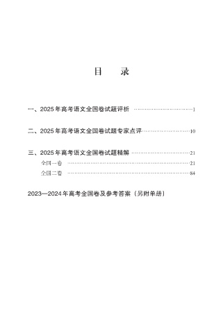 目 录 一、2025年高考语文全国卷试题评析 ……………………………1 二、2025年高考语文全国卷试题专家点评………………………10 三、2025年高考语文全国卷试题精解 ……………………………21 全国一卷 ……………………………………………………………21 全国二卷 ……………………………………………………………84 2023—2024年高考全国卷及参考答案 (另附单册)