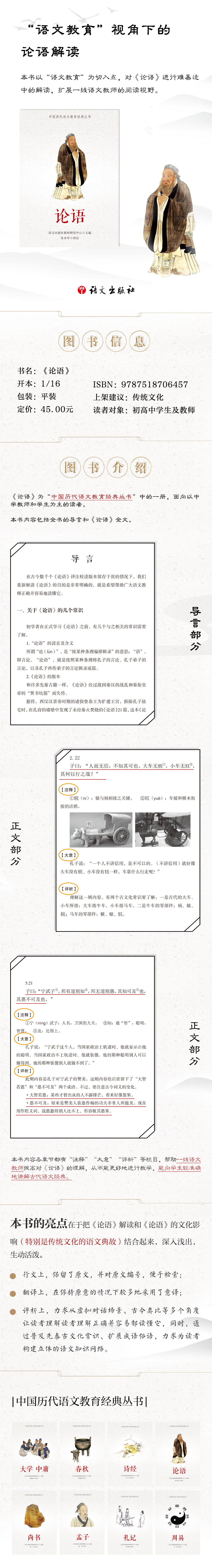 《论语》为“中国历代语文教育经典丛书”中的一册,面向以中学教师和学生为主的读者,以“语文教育”为切入点,对《论语》进行难易适中的解读,扩展一线语文教师的阅读视野。