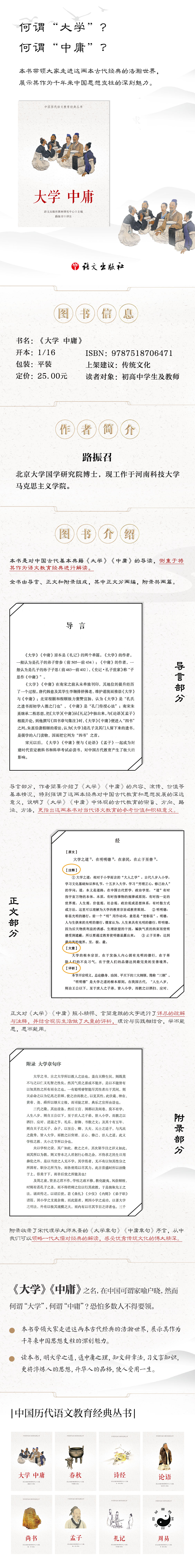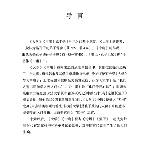 本书是对中国古代基本典籍《大学》《中庸》的导读本,侧重于将其作为语文教育经典进行解读。全书由导言、正文和附录组成,其中正文分两编,附录共两篇。