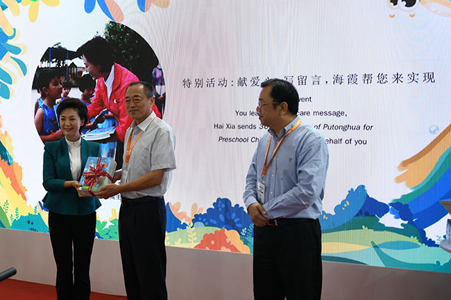 为了帮助贫困地区的孩子们更好地学习普通话,快乐成长,发布会还启动了“献爱心,写留言,海霞帮您来实现”公益活动。中国教育出版传媒集团、语文出版社委托海霞向贫困地区幼儿赠送《幼儿普通话365句》。现场观众购买《幼儿普通话365句》,并在扉页上写下爱心留言,以个人的名义委托海霞将书送到贫困地区幼儿手中。
